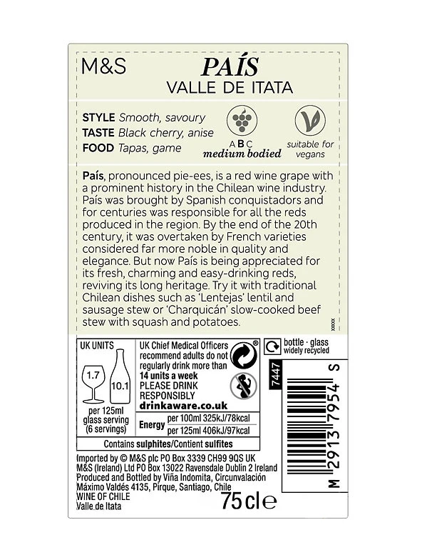 PaΓs, pronounced pie-ees, is a red wine grape with a prominent history in the Chilean wine industry. PaΓs was brought by Spanish conquistadors and for centuries was responsible for all the reds produced in the region. At the turn of the 21st century, it was overtaken by French varieties considered far more noble in quality and elegance. But now PaΓs is being appreciated for its fresh, charming and easy-drinking reds, reviving its long heritage. Try it with traditional Chilean dishes such as ‘Lentejas’ lentil and sausage stew or ‘CharquicΓ‘n’ slow-cooked beef stew with squash and potatoes.